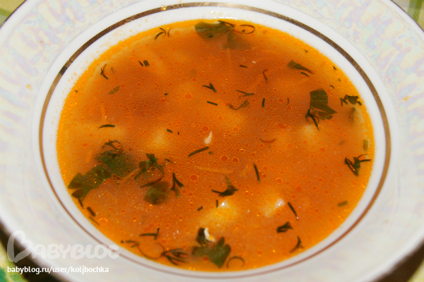 На сковороде обжарила морковь (ещё с осени я натёрла мелко на мясорубке с насадкой много(!) моркови и заморозила ),добавила почти ложку томатной пасты.Закинула в суп.Порезала укроп и петрушку и выключила.Из приправ НИЧЕГО нет,только соль.А суп вкуснющий))))))))) сама себе поражаюсь))) интересно.во второй раз тоже вкусный получится или просто удача улыбнулась))).