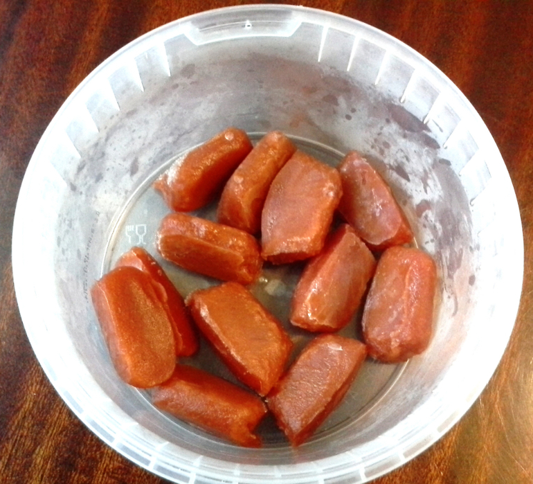 Эта непонятная штуковина в таре - томатная паста.Вытащила из морозилки,закинула несколько кубиков в подлив и решила сфоткать тоже ))) У меня томатная паста бывает пропадает,до конца не использую вовремя и приходится выкидывать,жалко,но так получалось,я не очень часто том.пасту использую. И тут я решила её заморозить,ведь у меня теперь есть морозилка отдельная ))) Сначала чуть смешала её с водой,в формочки для льда налила.Выскакивать не хотели,я подержала 5 секунд в чашке с горячей водой и они хорошоо вылетели.Ещё раз подморозила по-отдельности на доске и в тару убрала.