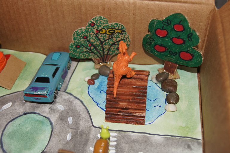 Пруд с мостиком,плодовыми деревьями и кустарниками,камешки на берегу ( крымские запасы пригодились).Всё на горячий клей приклеено. На мосту динозаврик,за ним улитка ползет по пешеходному переходу,тоже в парк хочет ))