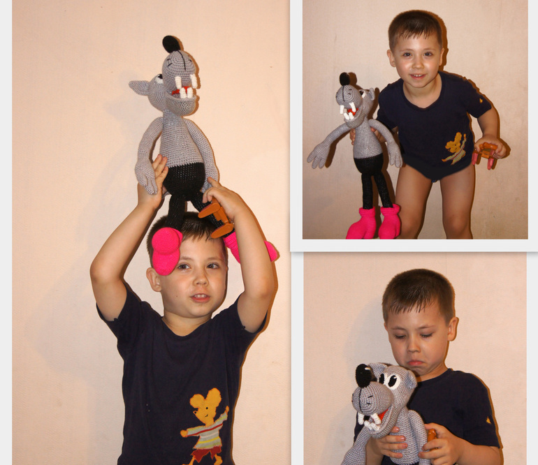 А пока Макс у меня отобрал волка и играет с ним.Это у него злой волк,который гоняется за поросятами,и жирафами,и пони,и даже за мамой охотится,но мама по носу ему быстро дает ))) Ночью взял спать с собой ))) он уже какое-то время спит без игрушек,а так обычно машинку какую-нибудь брал с собой.Волк пока в любимчиках ))