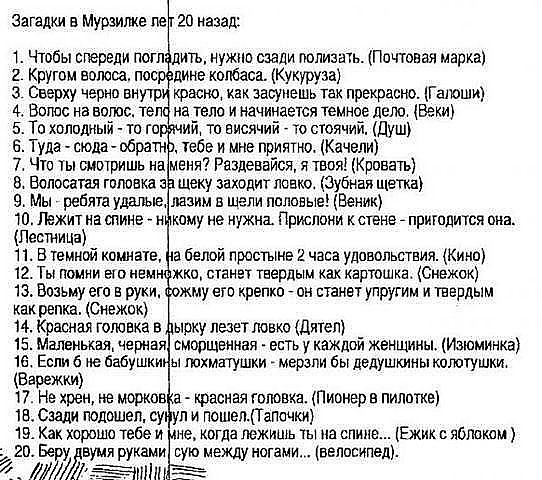 Вот неужели мы такие развращённые стали?Я абсолютно на каждую загадку подумала не тот ответ....