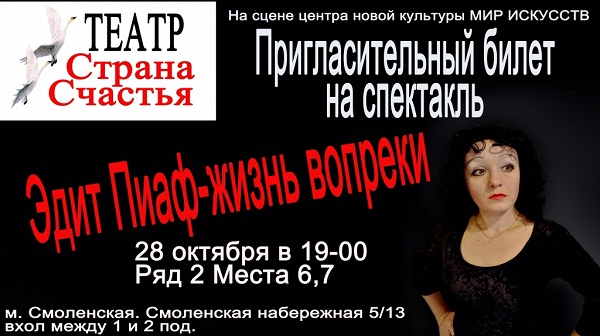 Культура, искусствоВчера побывали на шикарном спектакле "Эдит Пиаф-жизнь вопреки". Восторг и впечатления не выразить словами! Постановка, игра актеров, легкий для усваивания, особенно для не подготовленных и редко посещающих театры людей, сценарий и режессура, продуманная подборка музыкального материала и всего остального очень впечатлили. Кстати, у этого театра и детские спектакли есть. Если кому-то станет интересно, вот их группа ВК