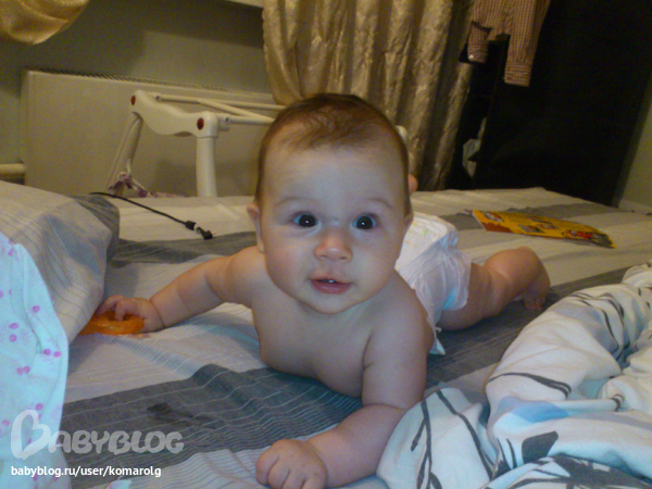 В этом месяце одна из самых ярких умелок - это стоять на ручках и коленках и раскачиваться на все лады. Я уже побаиваюсь за стойкость пеленального столика шведского производства, на нем кто-то умный и заботливый написал от 0 до 12, но это явно не про нас...