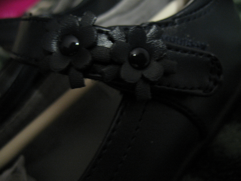 Кожа, резиновая подошва, с цветочными акцентами на ремешке и кожаной накладкой на пятке, регулируемое закрытие крюк-и-петля, с покрытием против вода и пятен, мягкая стелька. Цена: 2500 руб.