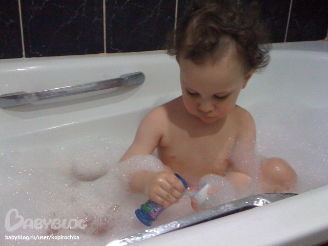 перевод: "пузя, иди" - это она с собой зовет мыльные пузыри, чтобы с пенкой купаться)))))