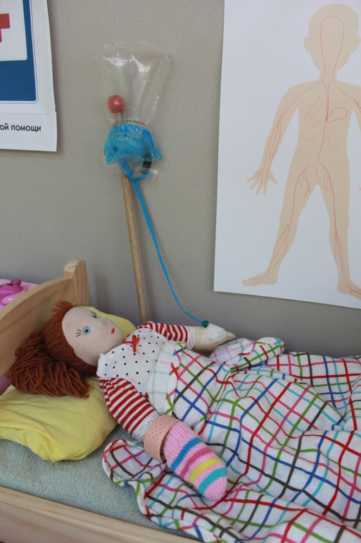 Роль катетера выпала мозаике (Даша придумала). Зафиксировали настоящим медицинским пластырем. Он бумажный, поэтому легко отклеивается. Доктор его прикрепляет к капельнице. А когда появляется новый больной, с легкостью отсоединяет от капельницы и уже зафиксированный катетер одевает на руку очередному больному.