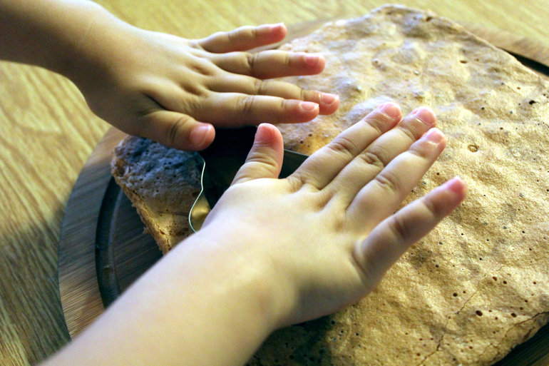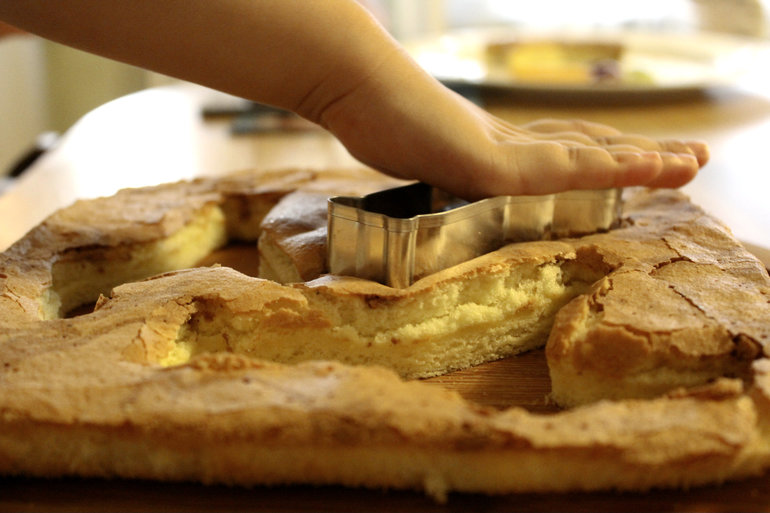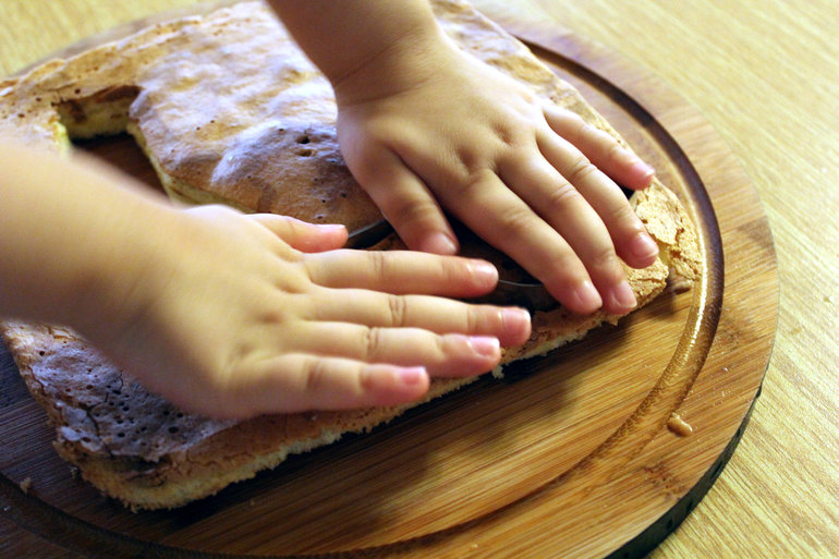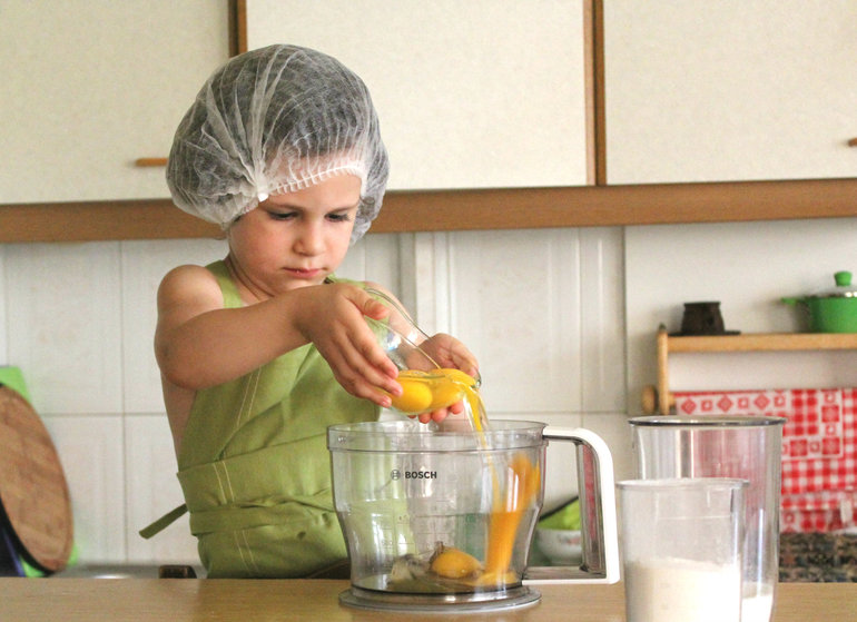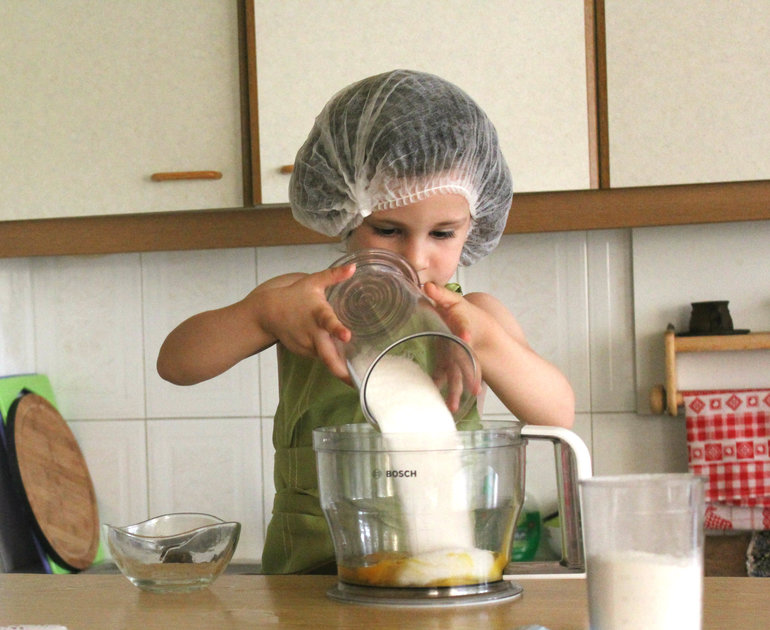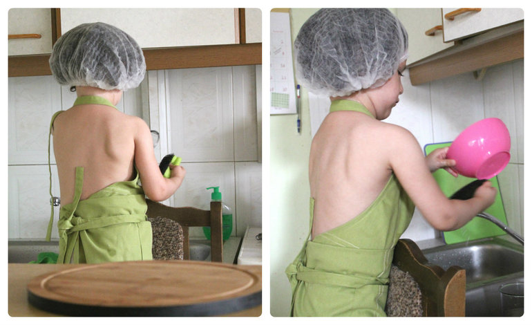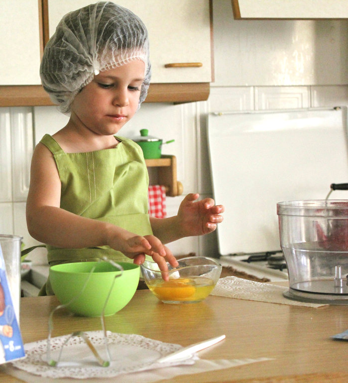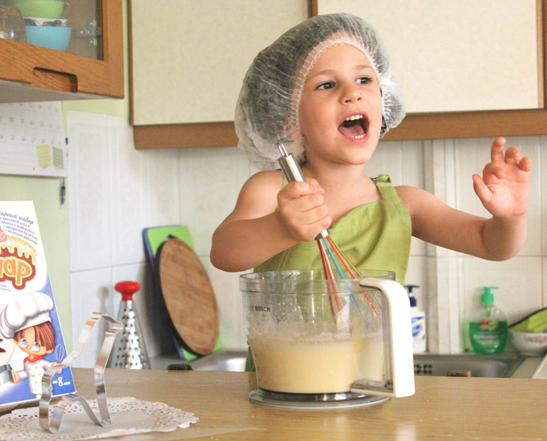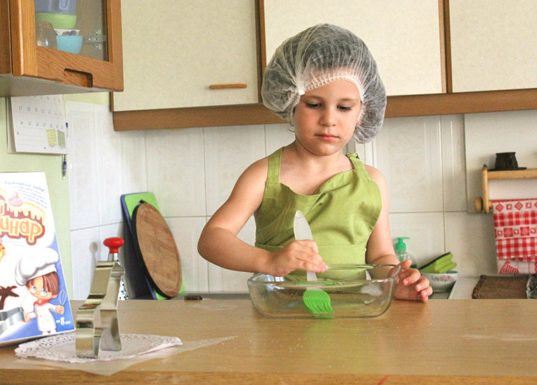 В набор входит рецепт, шапочка на волосы, фартук (мы одели свой), нож, формочка жираф, треугольник, декоративная салфетка.