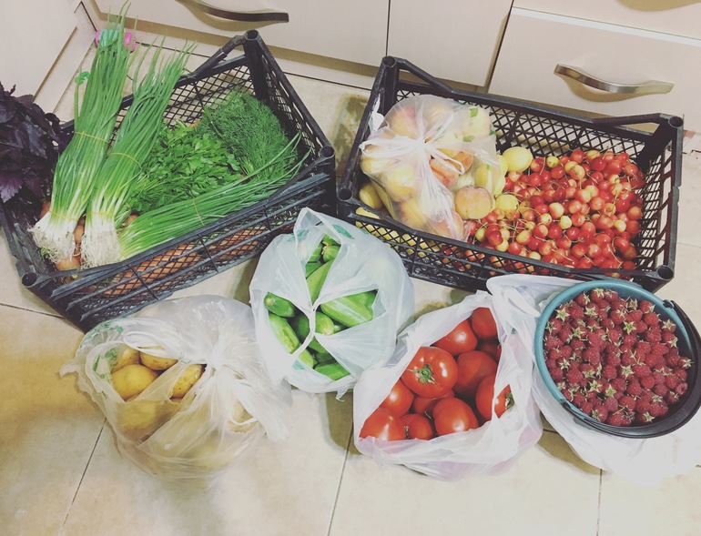 Даже не представляю, сколько у нас будет все это стоить. Но точно не 50 долларов. Ваши цены меня временами шокируют. Сыночку привозят с дачи бабушка и дедушка. Себе мы если покупаем, то понемногу, чтобы все съесть и ничего не пропало. Тем более что у нас мини-рынок за домом, а до того, что подешевле, 15-20 минут с коляской.