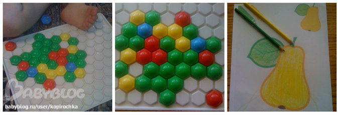 Так же сегодня Даша играла с мозаикой. Именно играла, вытаскивая из баночки по одной штучке и подбирала ей место, а не разбрасывала по всей комнате, как раньше.