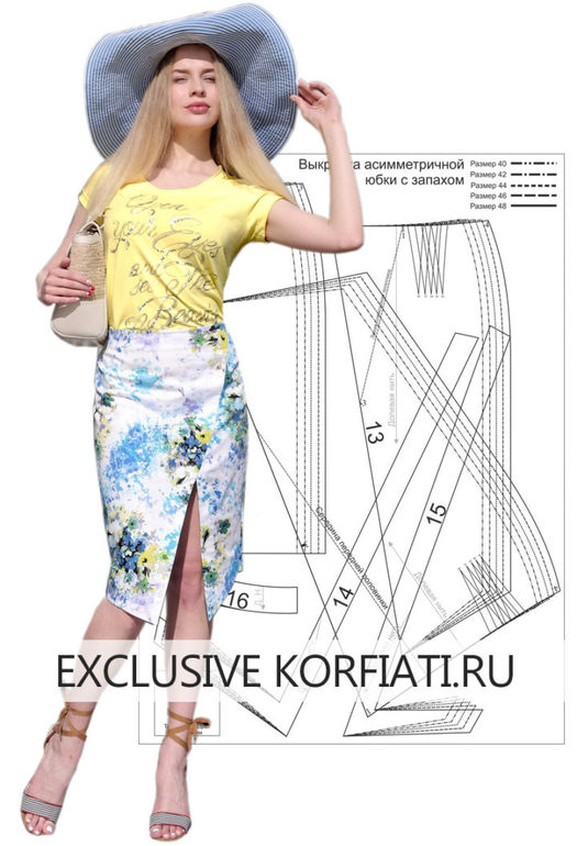 Скачайте готовую выкройку асимметричной юбки с запахом на 5 размеров