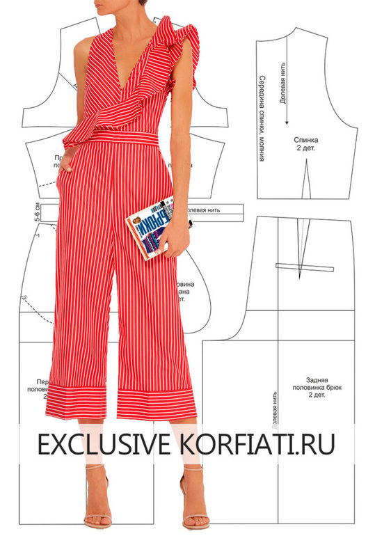 Элегантные женские комбинезоны давно стали неотъемлемой деталью в гардеробе современных женщин. И не случайно, ведь правильно подобранный и качественно сшитый комбинезон, является по сути универсальной одеждой, в которой с легкостью можно появиться как на званом ужине или торжественном приеме, так и беззаботно гулять по городу, встречаться с друзьями и проводить свободное время в свое удовольствие. Модель, выкройку которой мы предлагаем вам смоделировать самостоятельно, относится именно к таким универсальным моделям. В ярко-красном цвете в белую полоску этот комбинезон можно отнести к стилю кэжуал, но стоит сшить его из ткани глубокого черного цвета, как он легко трансформируется в вечернюю модель экстра-класса.