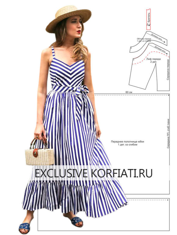 Сарафан - идеальная одежда для лета. Именно поэтому, с наступление жарких дней, мы предлагаем вам выкройку оригинального сарафана на бретелях с длинной юбкой. Легкий летящий силуэт, натуральная хлопчатобумажная ткань и крой, мастерски обыгрывающий сине-белый полосатый принт ткани, делают этот сарафан хитом сезона. Кроить и шить эту модель совсем не сложно, справятся даже начинающие мастерицы. Выкройка сарафана в полоску - в нашем очередном уроке.