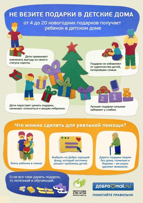 "хочу вам рассказать о подарках. О подарках, которые сейчас мешками начнут собирать в офисах, о елках в торговых центрах с желаниями о подарках "вот чего захотели сами детишки из детдома", обо всех этих умилительных вещах. В прошлом году, когда мы выпустили эту инфографику, меня спрашивали - как же так? Вот наши дети получат подарки - а "эти" нет! И я хочу на этот вопрос ответить еще раз. Наши с вами дети получают не только подарки. Они получают внимание, общение, пример взрослого и возможность общаться, срастаться или отталкиваться от этого взрослого. Наши дети получают СЕМЬЮ. Так вот. Никто не давал нам с вами право откупаться подарками ради мимими и легкости этого действия. Никто не давал нам права делить детей на наших ( и им семья, образование, общение) и тех (которым подарки раз в год, потому что это так мило). Давайте начнем помогать с умом! Есть способы помогать детям иначе. Более того, есть способы делать так, чтобы многие дети в систему детских домов не попали вообще - если направить усилия на разумную и эффективную помощь. Сделайте репост этой инфографики. Помогите детям правильно".