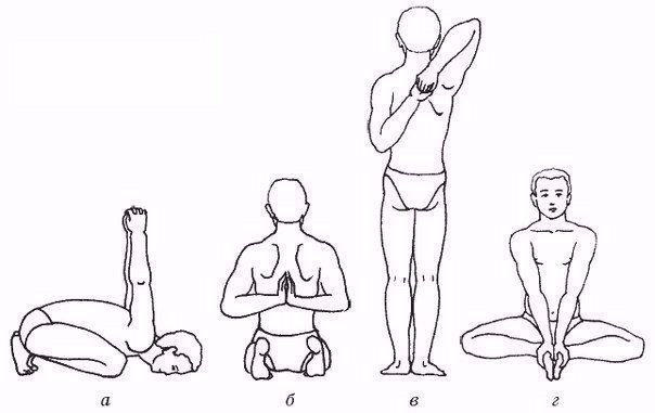 Упражнение 3. Сесть между пяток, как изображено на рис. б, руки согнуть за спиной, ладони сложить пальцами вверх (шея вертикально). Оставаться в этой позе 10-30 секунд, затем встать, пройтись и опять сесть в позу. Повторить 6-8-12 раз.