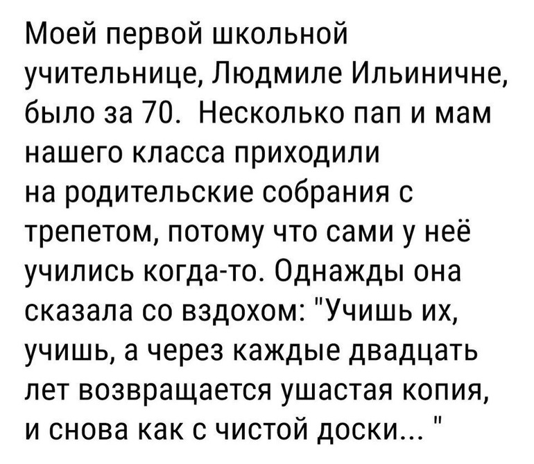 Моей первой учительнице было за 70... и мы были последним ее классом. Она устраивала с нами безмные мероприятия, возила нас в театр, в цирк, на море и даже водила в горы. После нас она собиралась уйти на пенсию. НО из школы просто так не уйдешь. Потом у нее был еще один выпуск, потом она выучила моего брата, потом еще два выпуска... Ушла она на пенсию, когда ей было почти 90. Она жила на нашей улице, и каждый проходящий мимо к ней заглядывал и спрашивал, не надо ли чего помочь\чего купить.