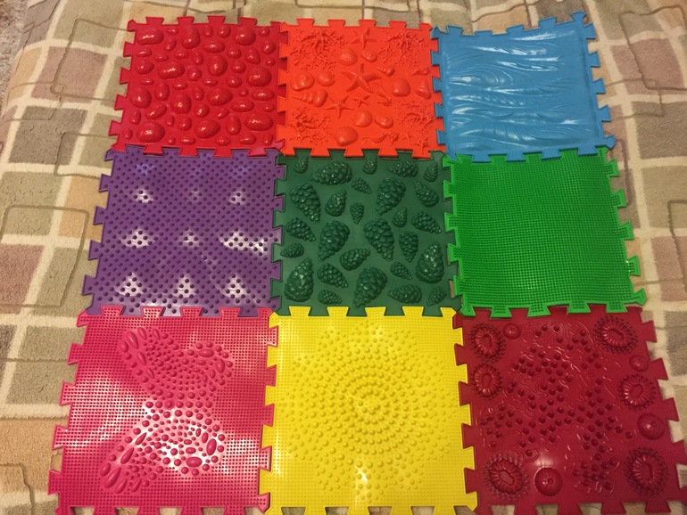 Благодаря различной фактуре и жесткости поверхности, во время занятий на ковриках «ОРТО ПАЗЛ» стимулируются все необходимые рецепторы стопы ребенка, способствуя формированию ее физиологических сводов.