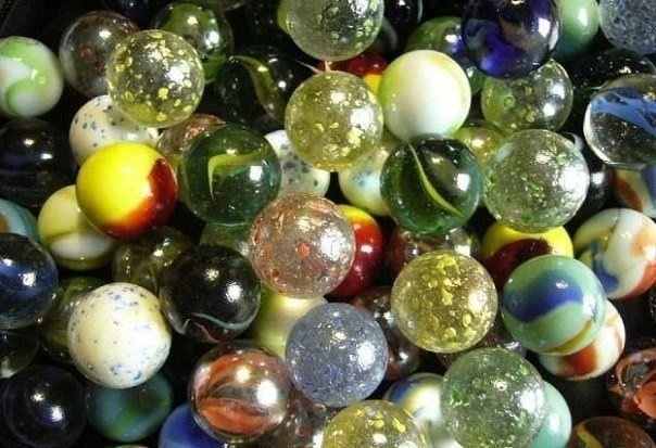 Детские сокровища. Шарики из цветного стекла диаметром около двух сантиметров. Наиболее ценными считались синие, зеленые и коричневые шарики. При падении шарики не разбивались, от них только откалывались кусочки.
