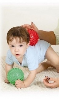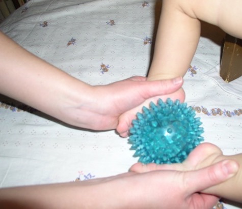 Садимся на пол на колени и даем детке в руки мячик с пупырышками.