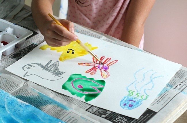Сначала белым восковым карандашом нарисуйте на бумаге волны. После этого раскрасьте лист акварельными красками синего и голубого цветов. Пока краска не высохла, посыпьте бумагу солью. На бумаге появятся интересные разводы, имитирующие морские волны.