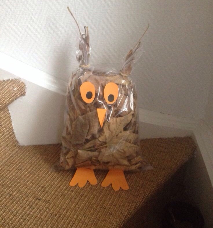 Вот такую забавную сову можно сделать из осенних листьев. Для этого соберите и сложите листья в прозрачный полиэтиленовый пакет. Верхние уголки пакета перетяните резиночками. Это будут ушки совы. Из цветной самоклеящейся бумаги вырежьте и приклейте глазки, клюв и лапки.