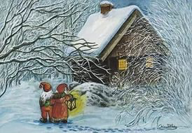 Маленькие гномики в чудных полосатых шапках с большими пумпонами,стояли во дворе около своего деревянного домика ,и задрав головы смотрели на небо ,на них сыпались удивительных размеров снежинки.Огромные белые хлопья снега ложились на их носы и пумпоны .Снег засыпал двор, красную крышу дома,колодец.и большую пушистую елку около дома ,от хлопьев елка казалась ещё больше пушистой и переливалась на солнце разноцветными искарками . Гономики взяли лопаты и ведерки им предстояло непросте дело расчистить большой сугроб наметенный за целую звездную ночь.