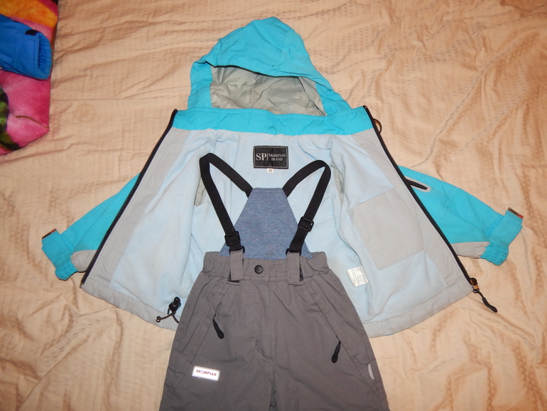 Очень теплый комплект. Промахнулась с размером. Куртка новая а штаны носили всего 2 недели, состояние отличное! в комплекте манишка и шарф из флиса.