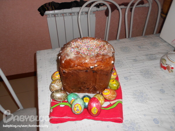 А вот и мой куличик и яйца,которые мы вместе с сынулей разукрашивали)) Кулич готовила в хлебопечке