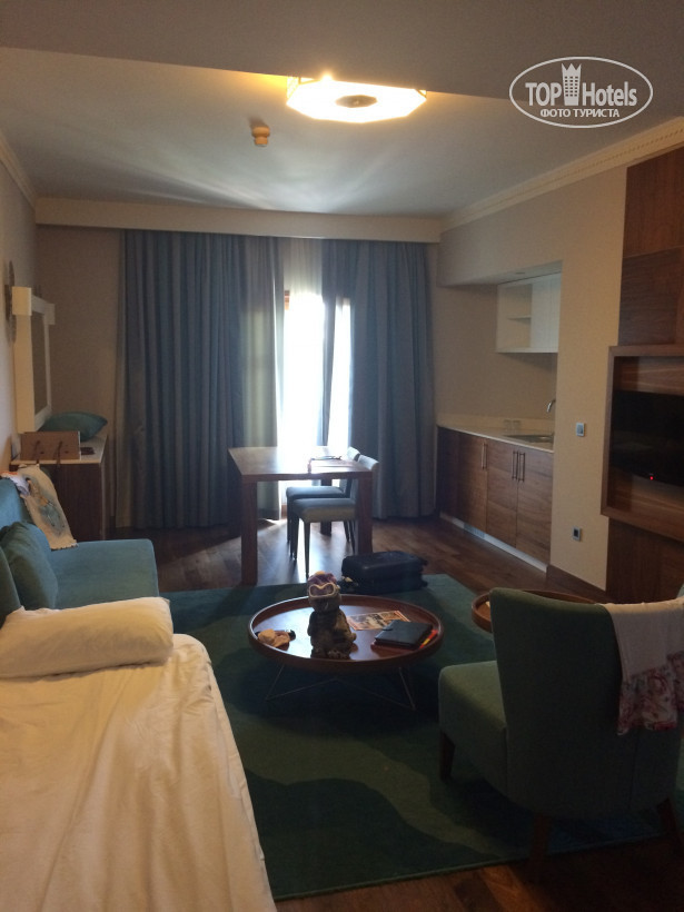 Итак, отдыхали семьей с ребенком 6-ти лет и двое наших бабушек. Бронировали на такой состав два стандарта в главном корпусе. Главный корпус выбрали потому, что, судя по прошлогодним отзывам, номера там получше, чем в бунгало и гарден-хаусе. Но заселили нас в семейный сьют с двумя спальнями, 2-мя ванными комнатами, гостиной и тремя балконами в том же главном корпусе. Мы были не против. Вообще, не первый раз нас таким составом заселяют в Турции в большие номера при забронированных стандартах.Приехали мы в 8 утра, заселились где-то ближе к 13.00. Пришлось два раза звонить на ресепшн, чтобы напомнить об обещанной дополнительной кровати для ребенка. Не очень-то приятно.