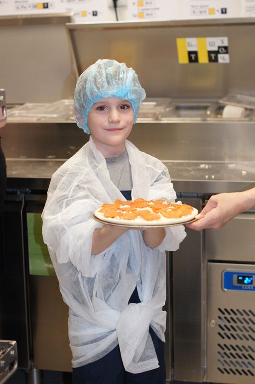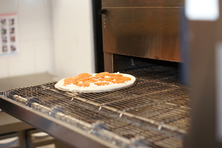 потом полуфабрикат ставится в печь. здесь меня лично постигло разочарование - печь не каменная, а электрическая. но процесс вполне забавный! пицца медленно едет на решетке внутрь, а с другой стороны выезжает полностью готовая!