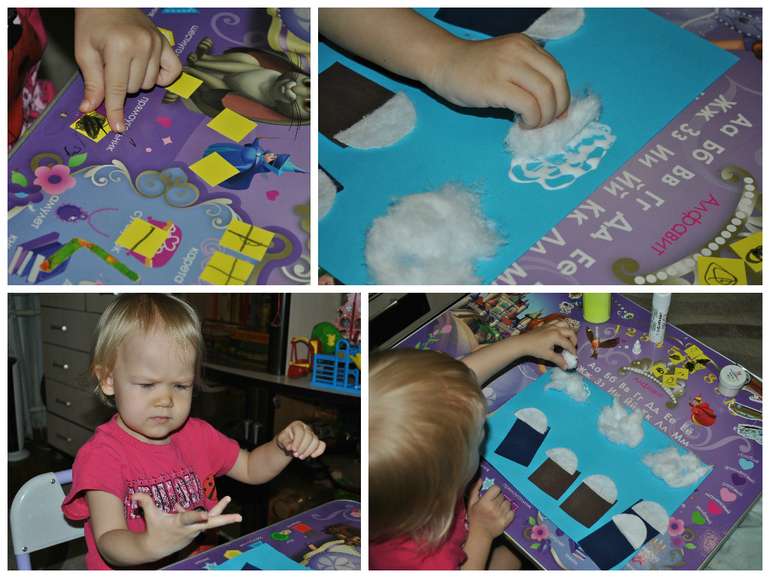 Теперь самое время продолжить творить снежный зимний город! Попробовали порисовать окошки, в них - линии. Но у Машули упорно рисовались окружности) Затем мы создавали снеговые тучи! Клей ПВА наносила я, а Маша брала кусочки ваты и приклеивала.