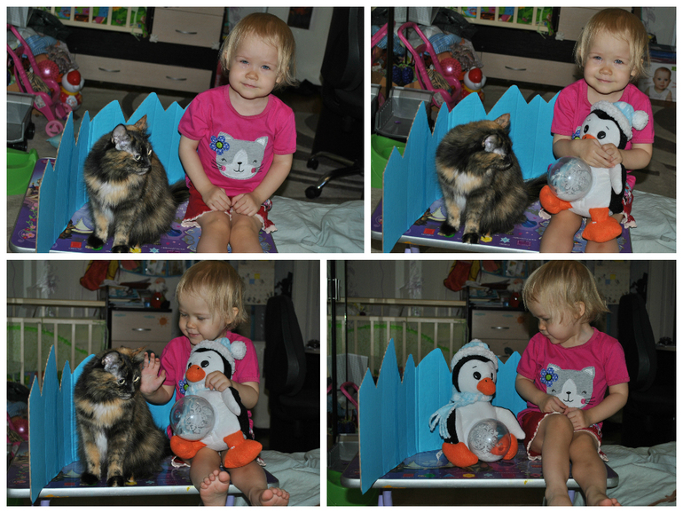 Пока Машуля играла сама, я делала заготовку для заснеженных гор, с которой дочка решила сфоткаться) И кошка тоже не осталась в стороне)