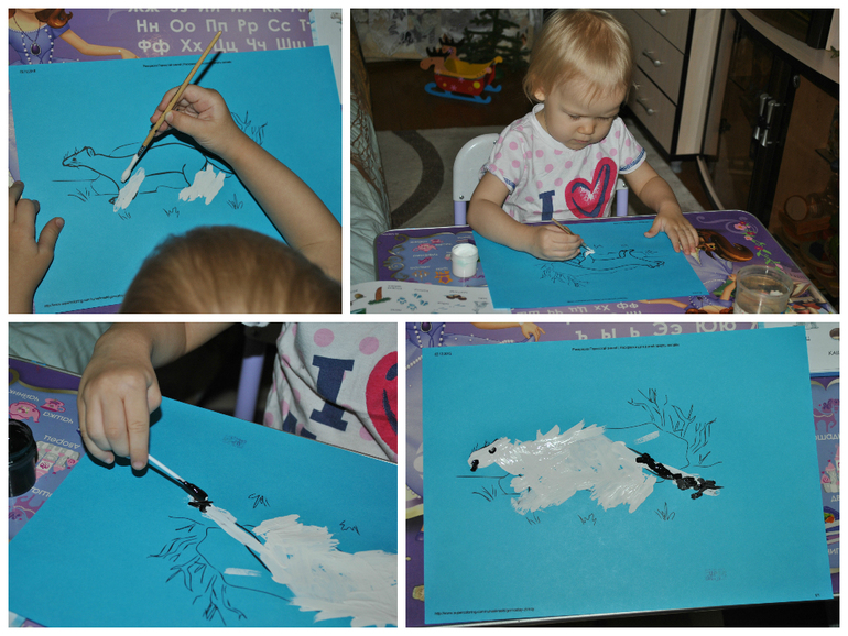 В этой книжке мы увидели горностая. И я подумала: а почему бы нам его не раскрасить? По-быстрому нашла раскраски с этим зверьком. И Машуля начала творить..) Кисточкой, а затем ватной палочкой. Я сделала акцент на том, что у горностая черненький кончик хвоста. Но дочка решила, что этого маловато))