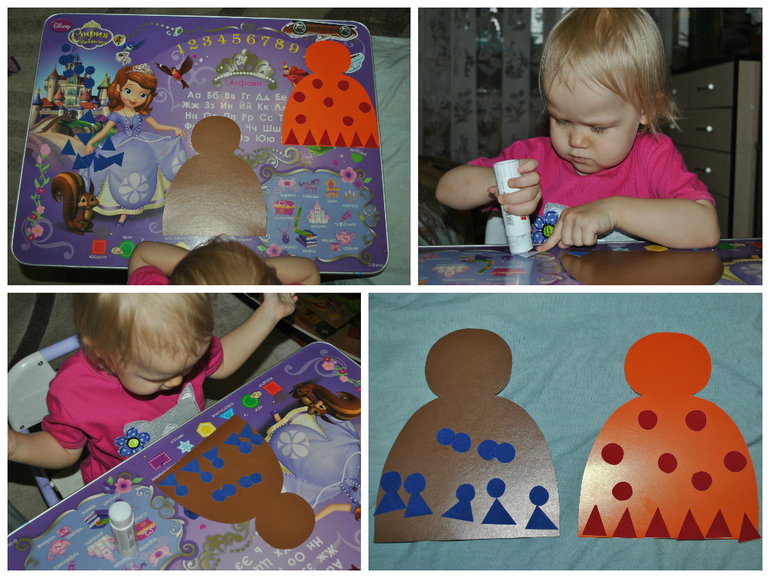 Настало время поговорить о зимней одежде и немного поклеить. Я придумала простой узор и выложила его на оранжевой шапке. Машуля сначала начала его повторять: приклеила треугольники по низу, затем один кружок, второй.. Третий приклеила к первому, четвертый ко второму! Вау! А потом она приклеила к каждому треугольнику по кругу! Вот это да.. И вышел у нее узор получше моего!!