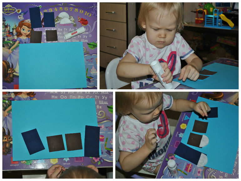 Затем мы начали делать снежный зимний город.. Сначала Манюша приклеила домики, затем половинки ватных дисков, которые я потом рассоединила, чтобы пушистая вата больше напоминала снег на крыше)