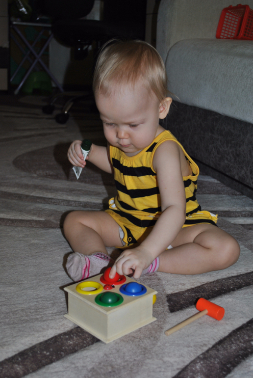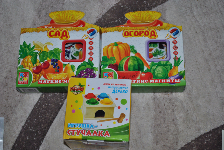 Скоро будем играть и изучать фрукты, овощи. Взяла мягкие магниты! Машуля очень любит магниты, думаю вместе с ними мы быстро все запомним..) Долго думала брать или нет стучалку. Муж опять был против.. Он всегда против всего, не обращайте внимания)) Сегодня утром показала Машуле, как нужно играть, минут на 10-15 это ее увлекло. И даже получалось выстукивать шары!