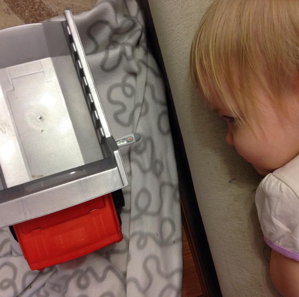 В последний день перед переездом бедной Машуле не во что было играть, кроме большого камаза. Она его и качала, баюкала.. И пеленала, укрывала.. И даже температуру мерила! На фото, если присмотреться, можно увидеть торчащий из машины электронный градусник.. Игрушечные инструменты доктора тоже были убраны..