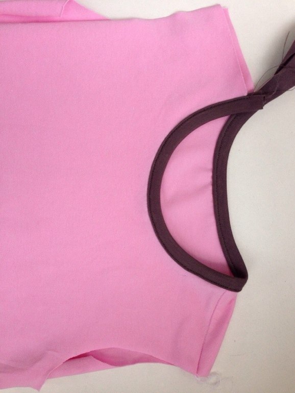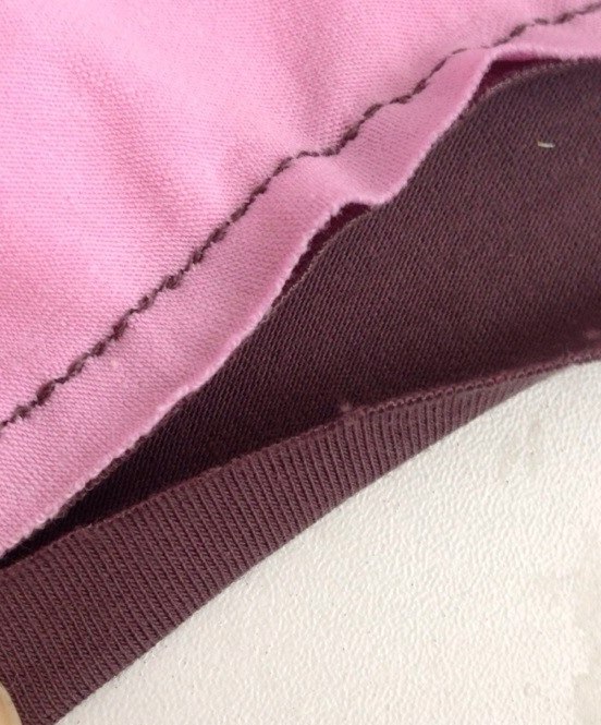 Теперь прикладываем нашу обтачку на изделие лицом к лицу, я ничего не скалываю поправляю в процессе шитья, делаю трикотажную строчку в крайнем положении иглы(это примерно 0,8 см). У меня на машине это строчка №15