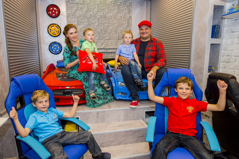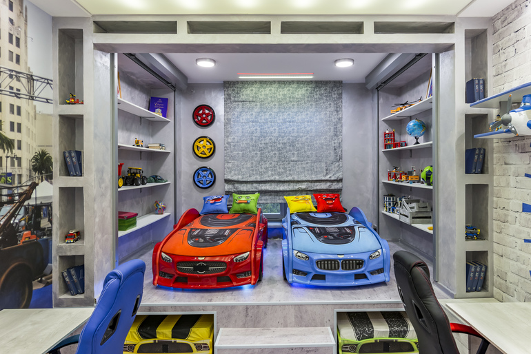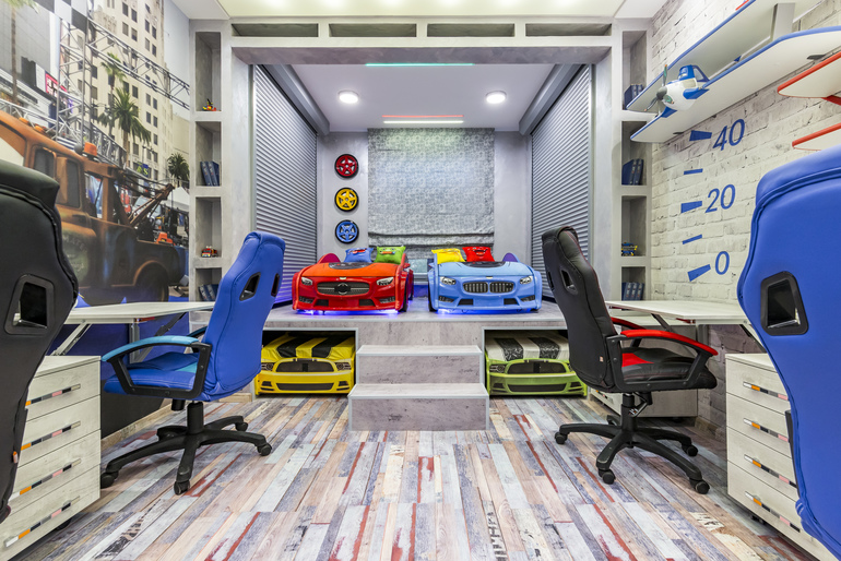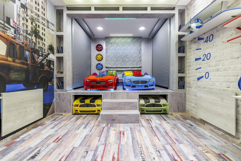 Разместить 4 статичные кровати на такой площади практически невозможно - они займут всю комнату, не оставив места для игр. Поэтому идеальное решение для этой задачи - подиум у окна. Две машинки-кровати расположили на нем, а две - под ним. Перед сном их можно легко выкатить и также легко убрать. Внутри кроватей - вместительное пространство для хранения постельного белья.