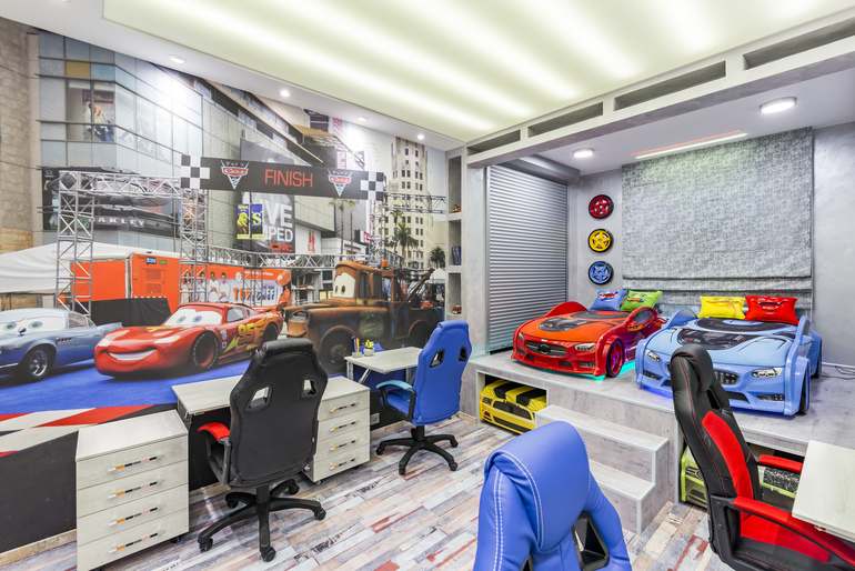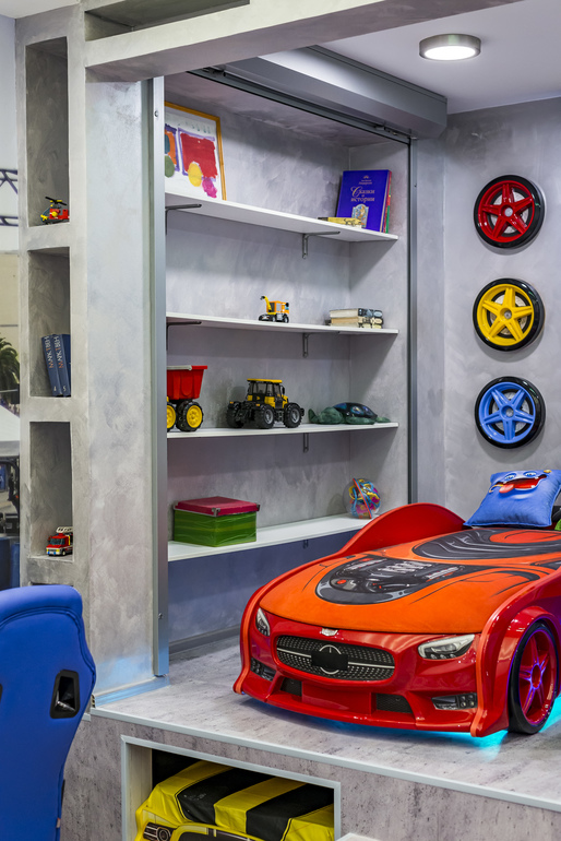 В комнате есть и серый цвет в имитации цемента, алюминия, бетона и кирпича - он уравновешивает яркие изображения города и гоночных машин.
