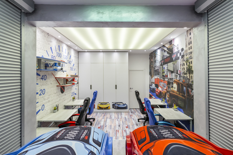 Чтобы рабочие столы не занимали игровую зону, дизайнер решила сделать их мобильными. Они легко откидываются и при желании складываются к стене, освобождая пространство. У каждого стола - своя тумбочка и эргономичный стул, внешне напоминающий кресло гоночного автомобиля.