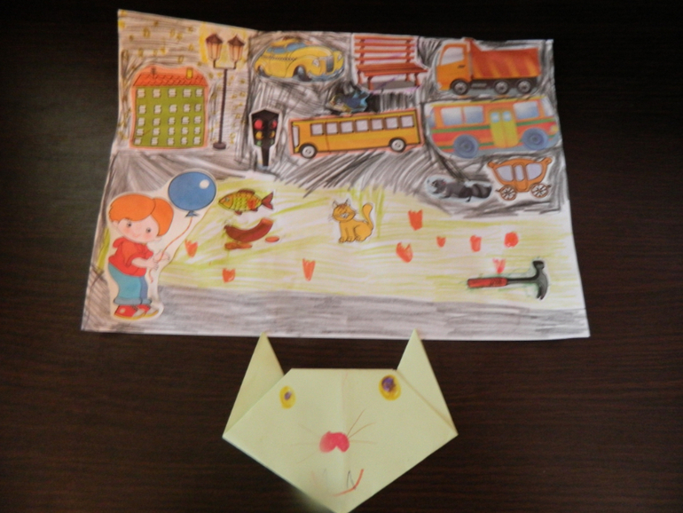 - Клеили аппликации из картинок, которые я вырезаю из разных журналов и пособий, перед тем как их выбросить. Иделали оригами "Котик". Делал Илья, я только подсказывала.