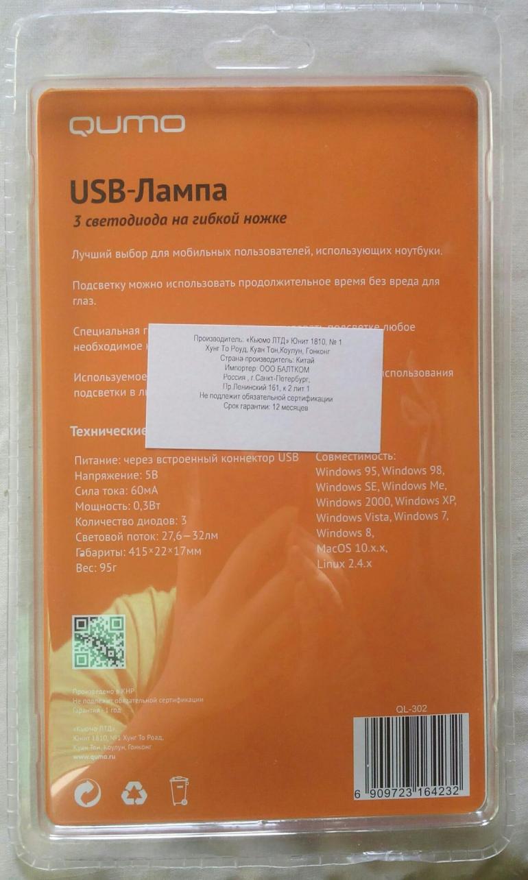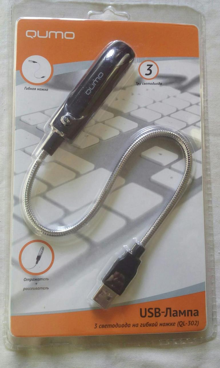 USB-лампа QUMO, новая, в упаковке - 300 рублейСветодиодная лампа с юсб-разъёмом QL-302. Прекрасная подсветка клавиатуры без вреда для глаз. Новая, невскрытая в блистере. Гибкая ножка, 3 светодиода, есть отражатель и рассеиватель. Габариты 415х22х17 мм, вес 95 г.