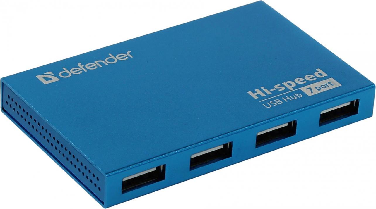 USB-разветвитель 2.0 Defender Septima Slim, 7 разъёмов, USB Type A, cиний, металлический корпус. Он же USB-концентратор, он же USB-хаб. Предназначен для подключения периферийных устройств к компьютеру. Просто не пригодился. Упаковка не прилагается, но был в блистере. Полностью исправен, состояние идеальное. Драйвера не нужны, поддержка режима Plug-n-Play. Срок годности не ограничен. Питание от сети и от юсб-порта, кабели прилагаются. Слотов для карт памяти нет, только юсб.