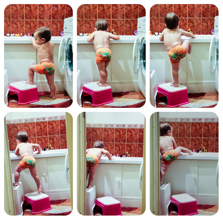 в-третьих, Ромка очень любит мыть посуду. ставлю его на стул около мойки, выдаю чего-нибудь небьющегося, включаю воду и всё, ребенок потерян для общества.