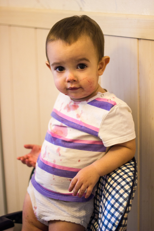 в-четвертых, Ромка неплохо кормит себя сам. с супом, пока, конечно, не очень, но вот всякие пюре и густые каши вообще отлично ложкой наяривает. с вилкой тоже периодически получается - в зависимости от удобства накалывания. ну а руками - вообще на ура :) из чашки пьет сам, но остаток обязательно надо опрокинуть на стол и растереть, поэтому наливаю по паре глотков. а после еды очень забавно вытирает выданной салфеткой сначала рот, а потом стол.
