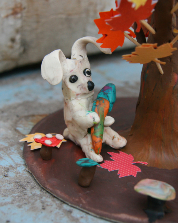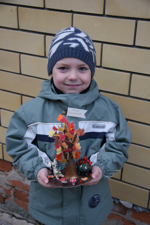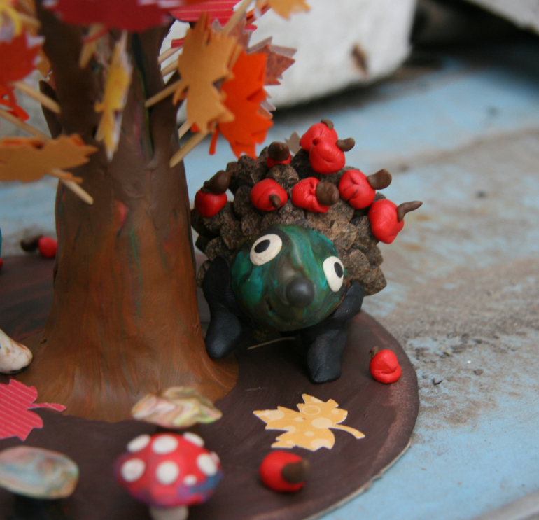 ёжика, зайчика придумал слепить Макар, он ими и занимался самостоятельно. аккуратно налепил целую куча яблок и всех усадил под деревом