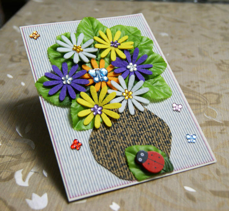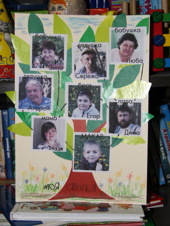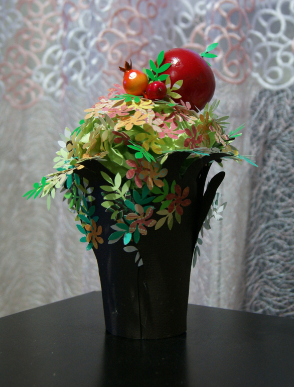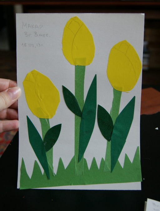 самостоятельно: вырезал листочки, все приклеивал, рисовал травку и цветочки. а так же писал надпись.
