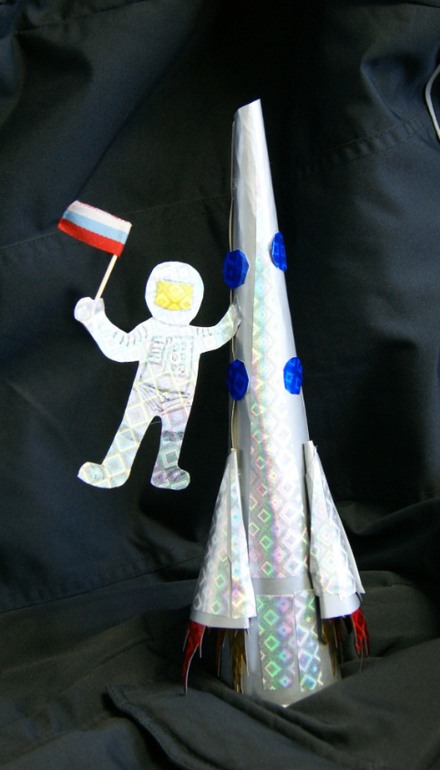 я делала основу из картона. потом Макар обрызгал сам пакет серебристой краской.