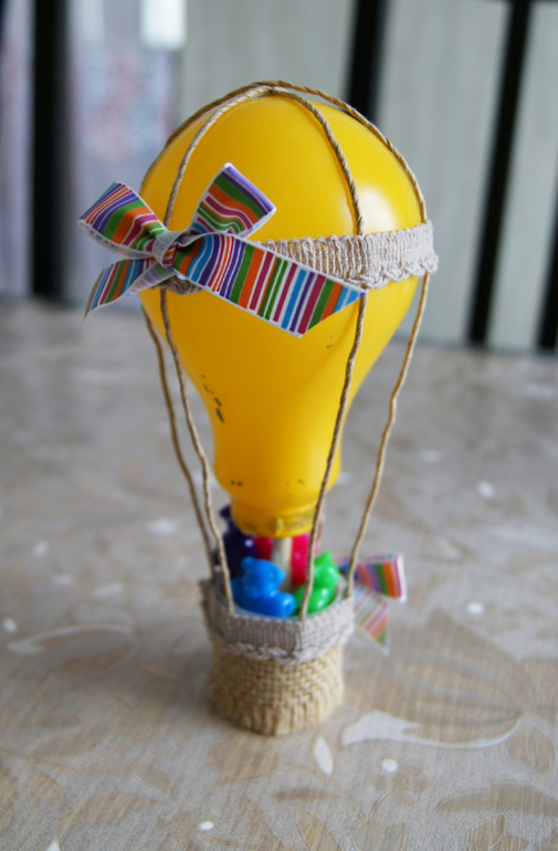 мы продолжаем с Егором тему воздухоплаванья. и очередной наш шедевр эксперимент был начат с лозунга "даем вторую жизнь старым вещам". нужно было в школу принести поделку из ненужностей. я опять ломала себе голову. перекопала все что могло бы нам подойти в своем кабинете... пока в руки не попалась большая лампочка, еще в прошлом году окрашенная в желтый цвет... и понеслось.