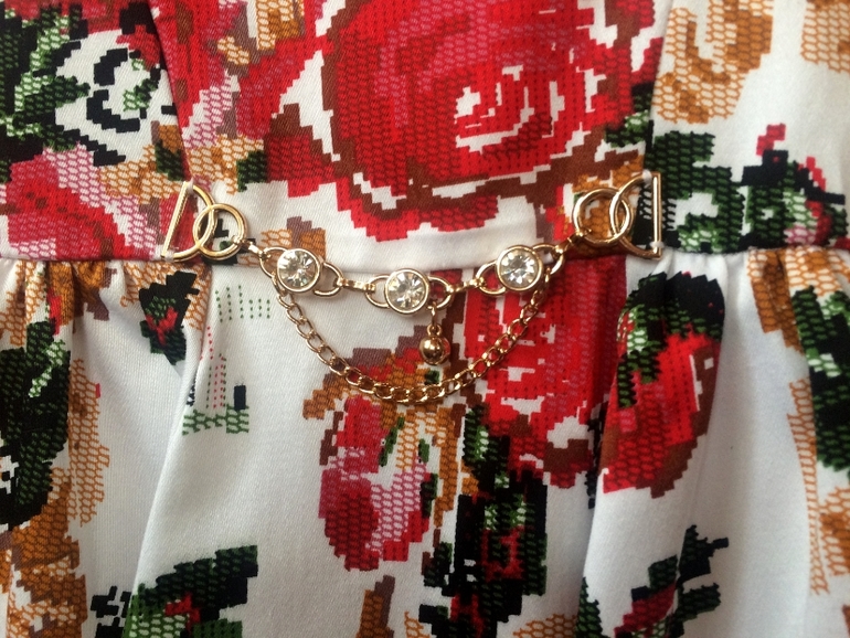 Коктейльное платье из хлопка с набивным рисунком. Полностью на хлопковой подкладке. На подъюбнике нашивные ярусы фатина. На талии пришивной золотой элемент. На юбке прорезные карманы. На спинке потайная молния.